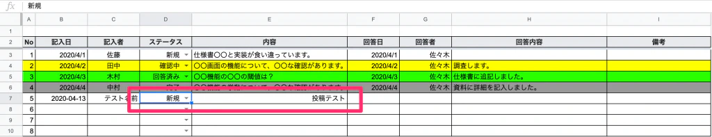 ▼ この記事で実現できること 特定の列(例:ステータス列)が編集されたら、対応する行の日付列と担当者列に自動で情報が入力されます。