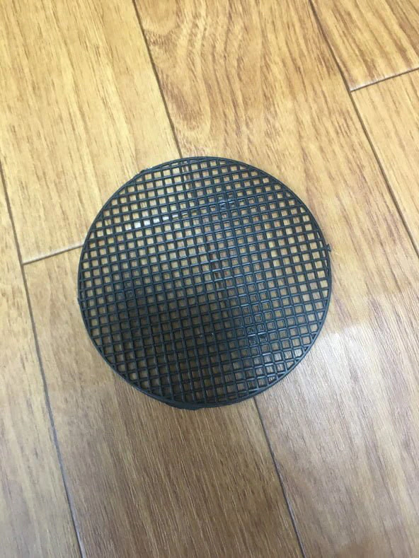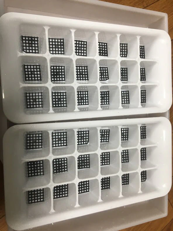 次に、鉢底ネットを各製氷皿の底のサイズに合わせてハサミでカットし、はめ込みます。これにより、バーミキュライトが穴からこぼれ落ちるのを防ぎます。