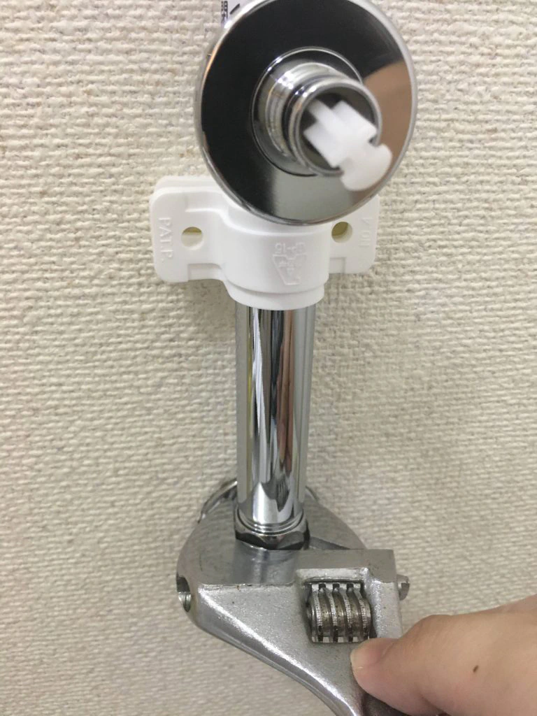 テープを巻いたら、取り付け口に時計回りにねじ込みます。最初は手で回し、固くなったらスパナで締め付けます。