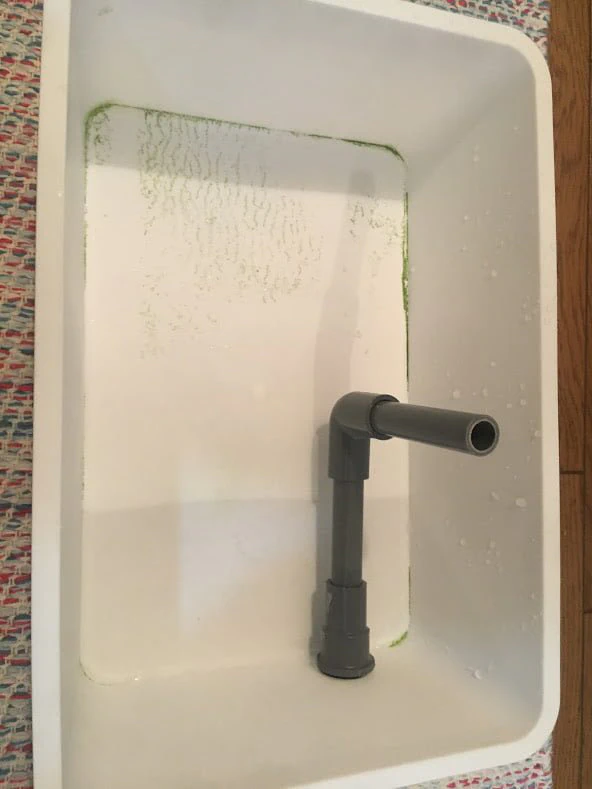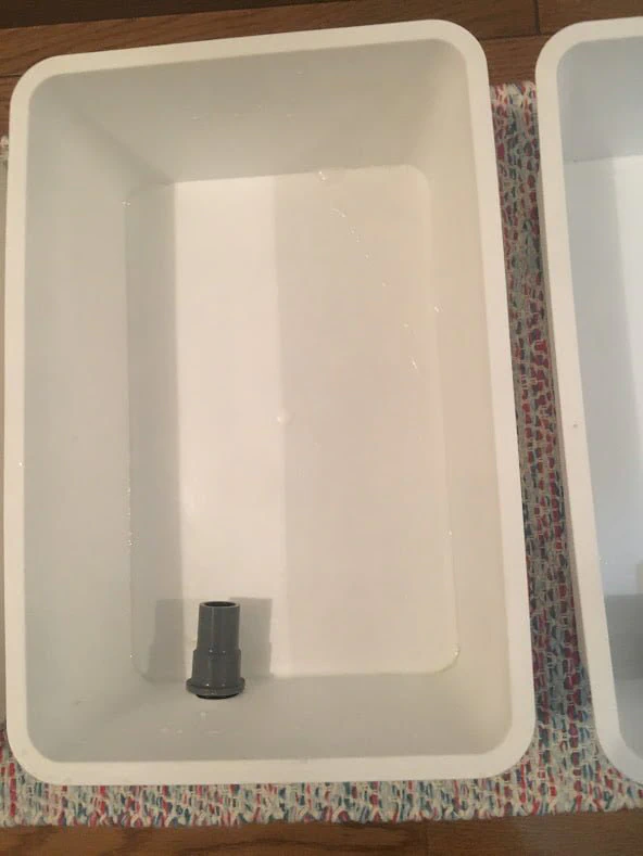 塩ビ管を必要な長さにカットし、コンテナに穴を開けて継手とOリングで接続します。水位を調整するためのオーバーフロー管もここで作ります。