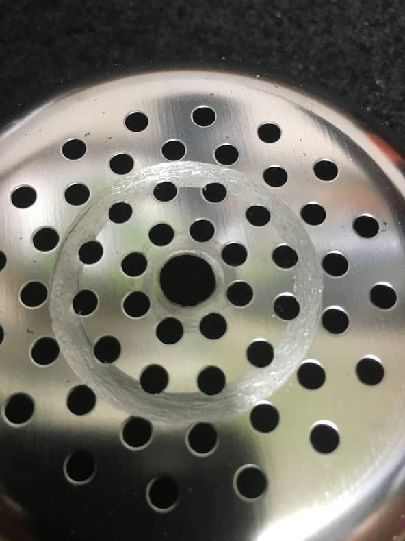まず、ステンレス製のゴミ受け(ランプシェード)にLEDライトを通すための穴を開けようと試みましたが、ホールソーでは歯が立ちませんでした。