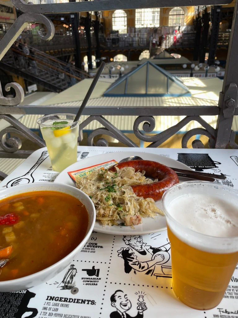 市場の2階にあるレストランで、ハンガリーの定番料理であるグヤーシュスープと粗挽きソーセージを注文。地元の人々に混ざって食べるランチは、旅行者にも人気の体験です。合計7300Ft(約2,978円)でした。