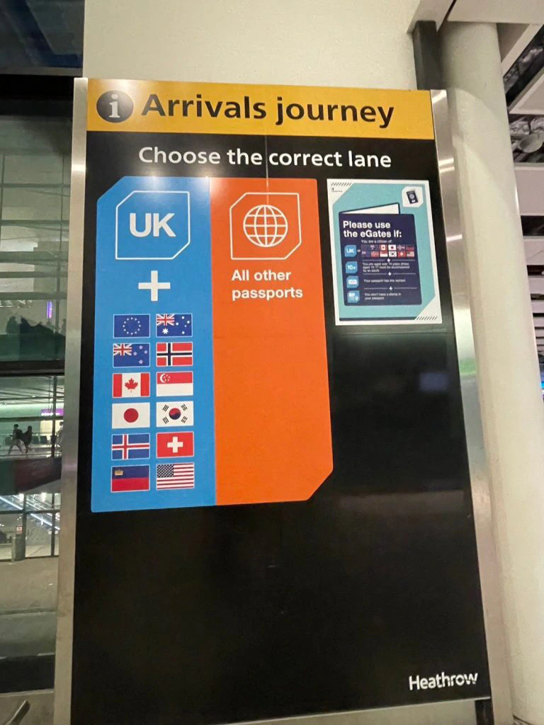 ヒースロー空港では、日本国籍であれば自動化ゲート(ePassport Gates)が利用できると事前に調べていましたが、私たちの場合は何度試してもエラーが発生し、結局は通常レーンでの手続きとなりました。自動化ゲートが使えない場合でも焦る必要はありません。通常レーンではパスポートを提示するだけでスムーズに入国でき、スタッフも非常にフレンドリーでした。