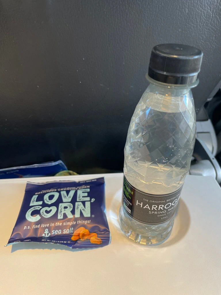 機体は少し古さを感じるものの、座席の広さはタイ国際航空と変わらない程度で、3時間30分のフライトも快適に過ごせました。フライト中には水とお菓子が配られ、短時間のフライトでもサービスが行き届いています。