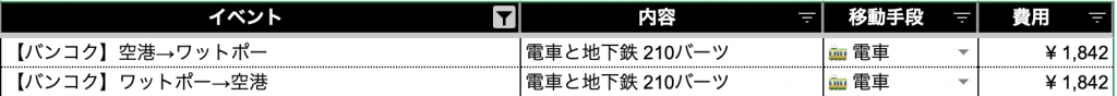 行きのタイ乗り継ぎ時に観光目的で電車を利用した際の移動費です。
