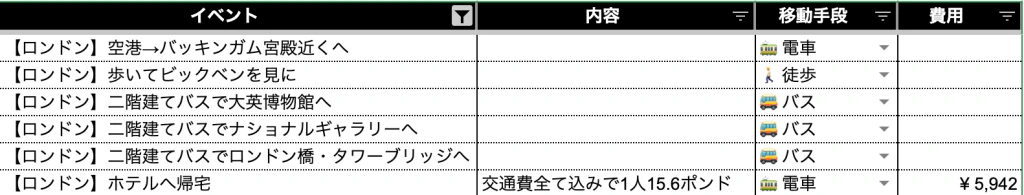 ロンドンでは、クレジットカードをタッチするだけで地下鉄も2階建てバスも利用でき、非常に便利でした。合計金額はクレジットカードの明細から算出しています。