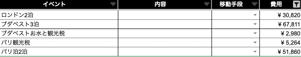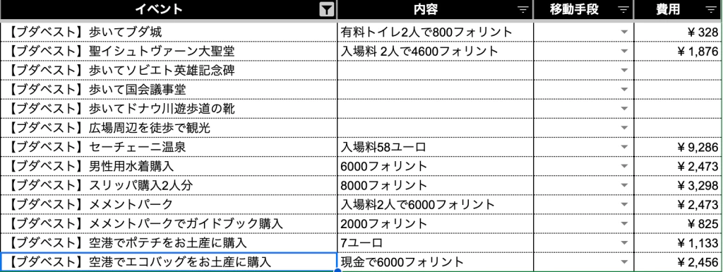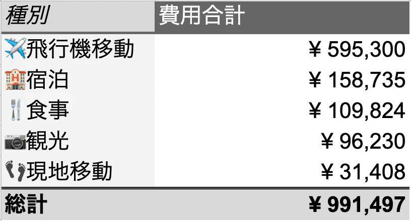 この旅行で最も長く3泊4日滞在しましたが、物価が日本より少し安いこともあり、観光費用はこの程度の金額に収まりました。