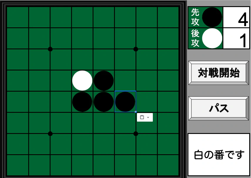 - 石の置き方: 黒または白の石が置かれているセルをコピーし、置きたいマスに貼り付けます。ルール上置ける場所であれば、相手の石が自動でひっくり返ります。