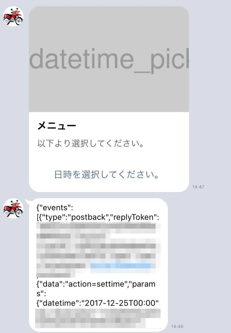 ユーザーが日時を選択すると、postbackイベントとしてdataで指定したデータと、選択された日時(params.datetime)がWebhookで送信されます。