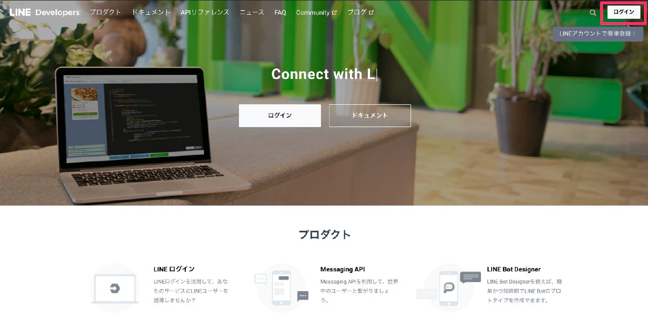 LINE Developers画面右上の『ログイン』ボタンを押します。