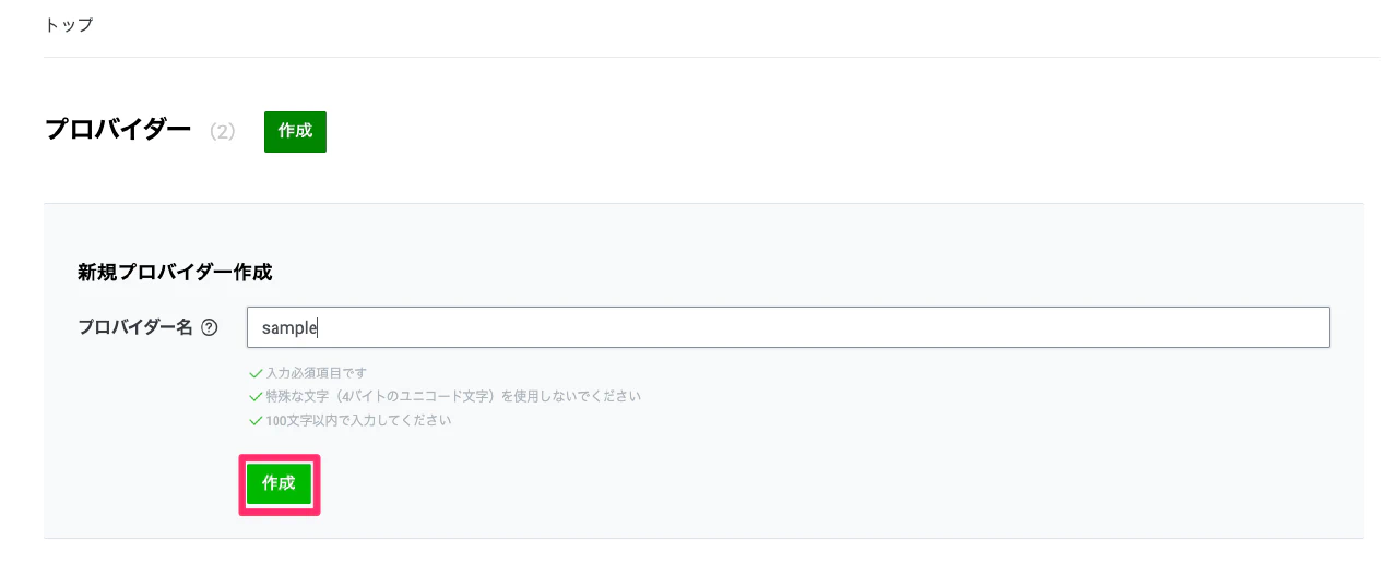 任意のプロバイダー名(個人名やチーム名など)を入力し、『作成』を押します。