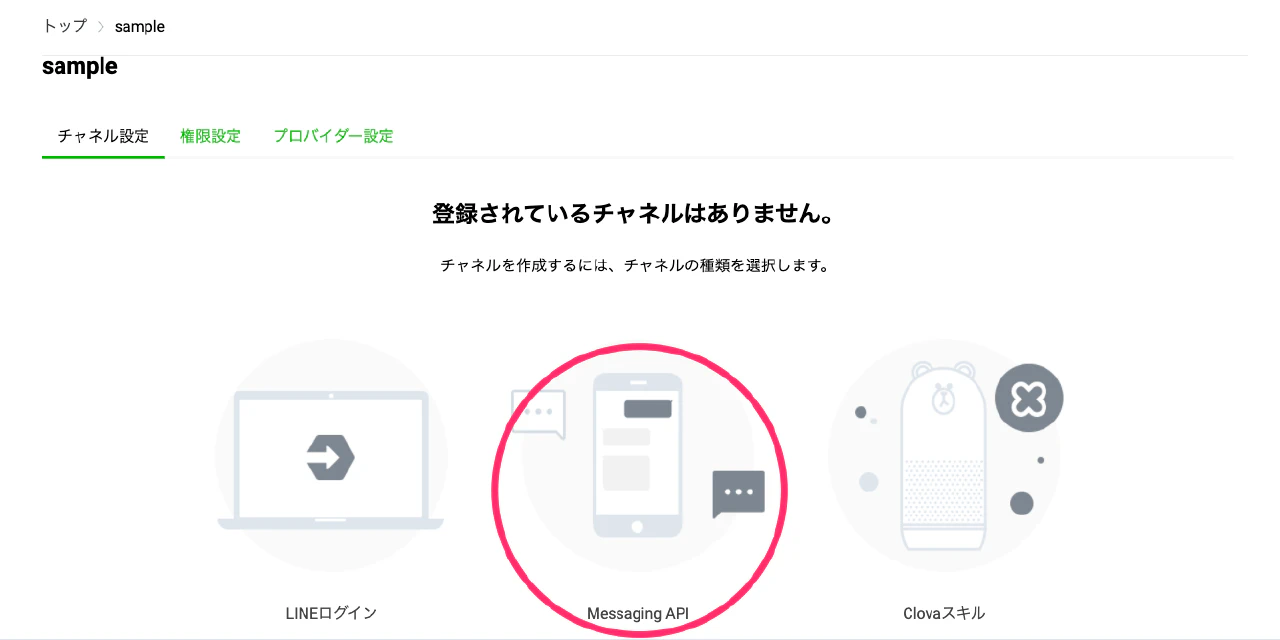 次に、作成したプロバイダーの中に、LINE BOTの本体となる「チャンネル」を作成します。
