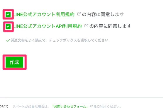 LINE公式アカウント利用規約などを確認し、同意のチェックを入れて『作成』ボタンを押します。