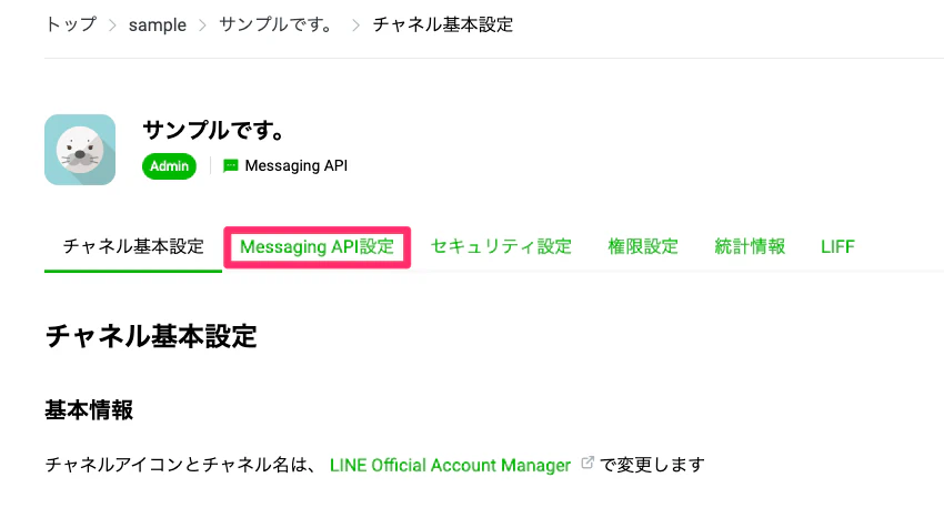 チャンネル管理画面の上部にある『Messaging API設定』タブをクリックします。