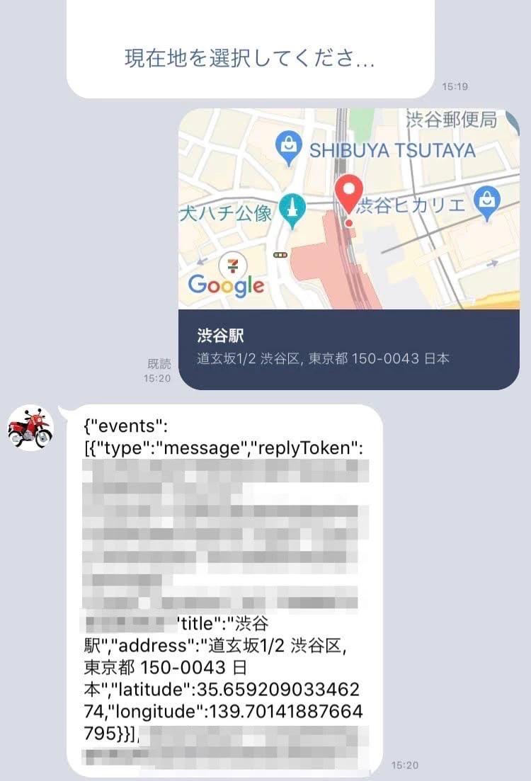 ユーザーが位置情報を送信すると、WebhookイベントとしてGASに通知が届きます。その中には住所、緯度、経度といった情報が含まれているため、店舗検索やルート案内など、様々なサービスに応用できます。