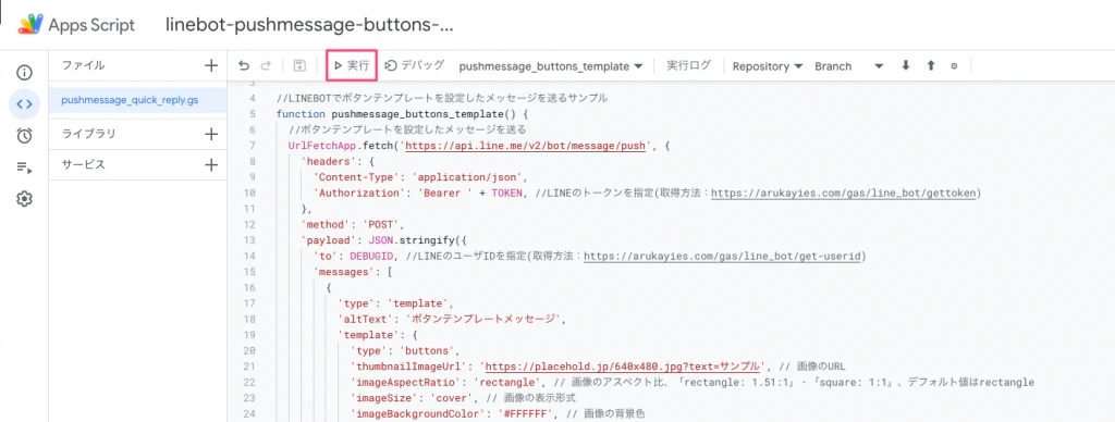 GASのスクリプトエディタでpushmessage_buttons_template関数を実行します。