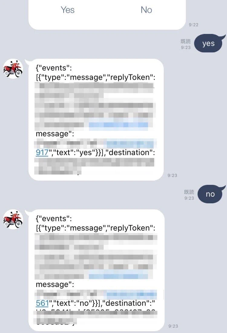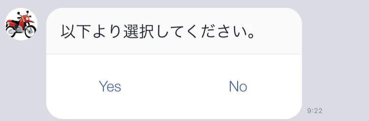 各ボタンをタップすると、actionsで指定したテキストがBOTに送信されます。