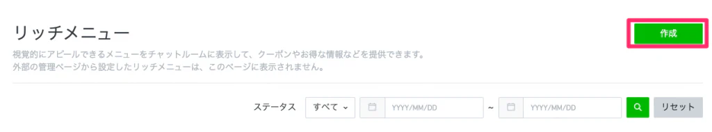 サイドメニューからリッチメニューを選択し、『作成』ボタンをクリックします。