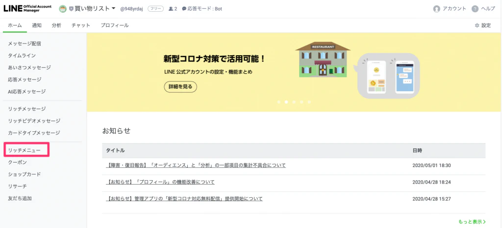 次に、ユーザーが直感的に操作できる「リッチメニュー」を作成します。