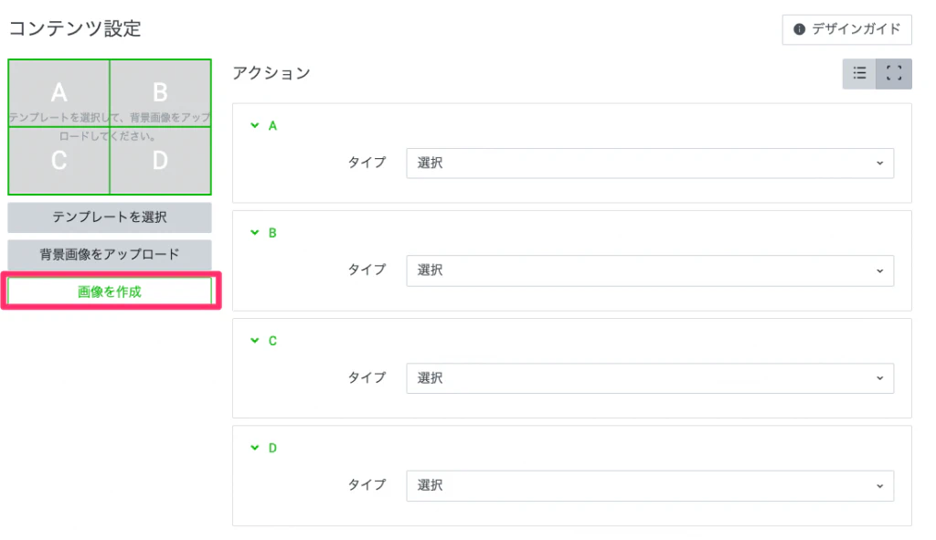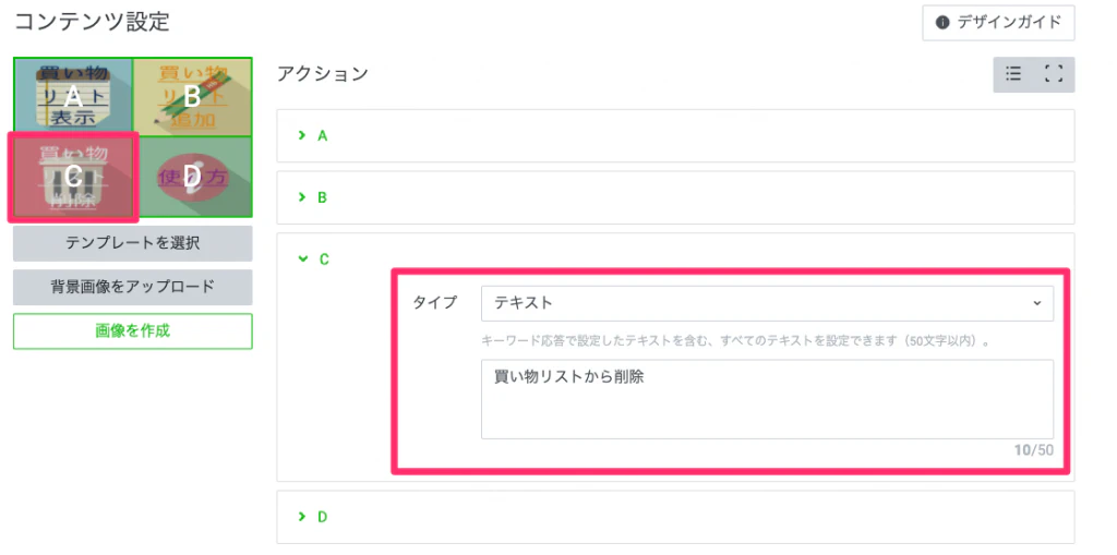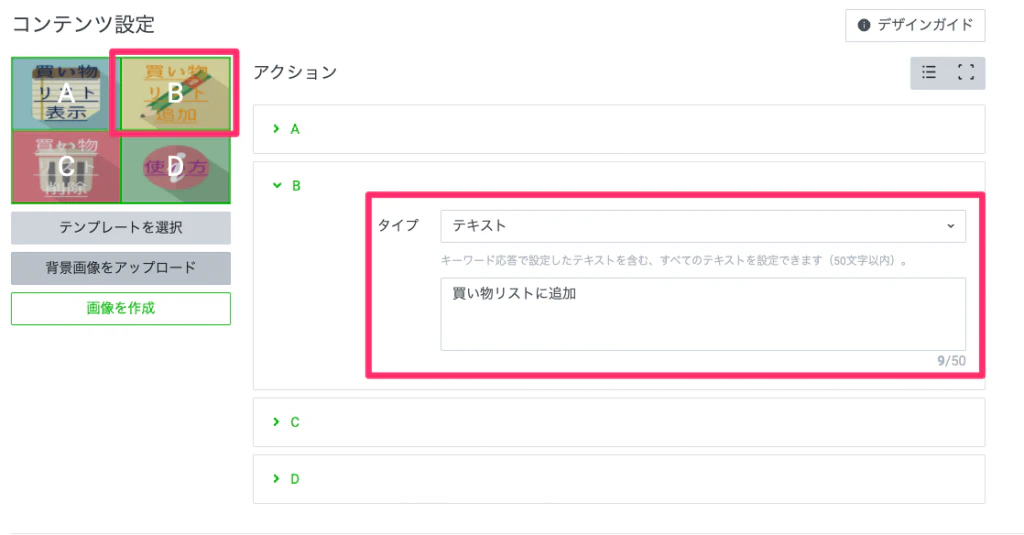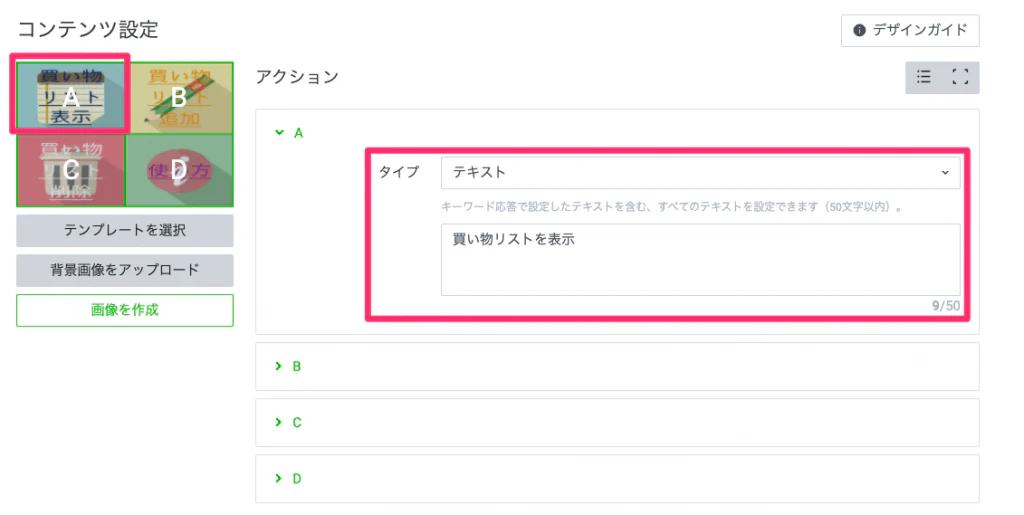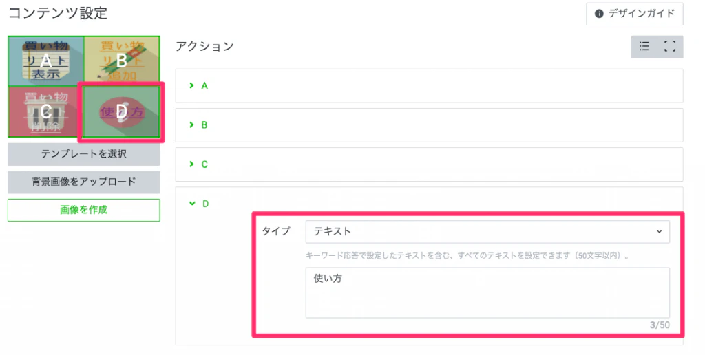 各エリア(A〜D)にアクションを設定します。タイプを『テキスト』にし、以下の通り入力します。