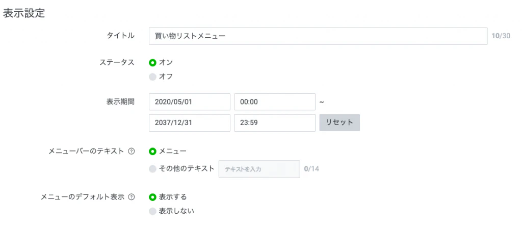 表示設定を入力します。メニュー名や表示期間を任意に設定してください。