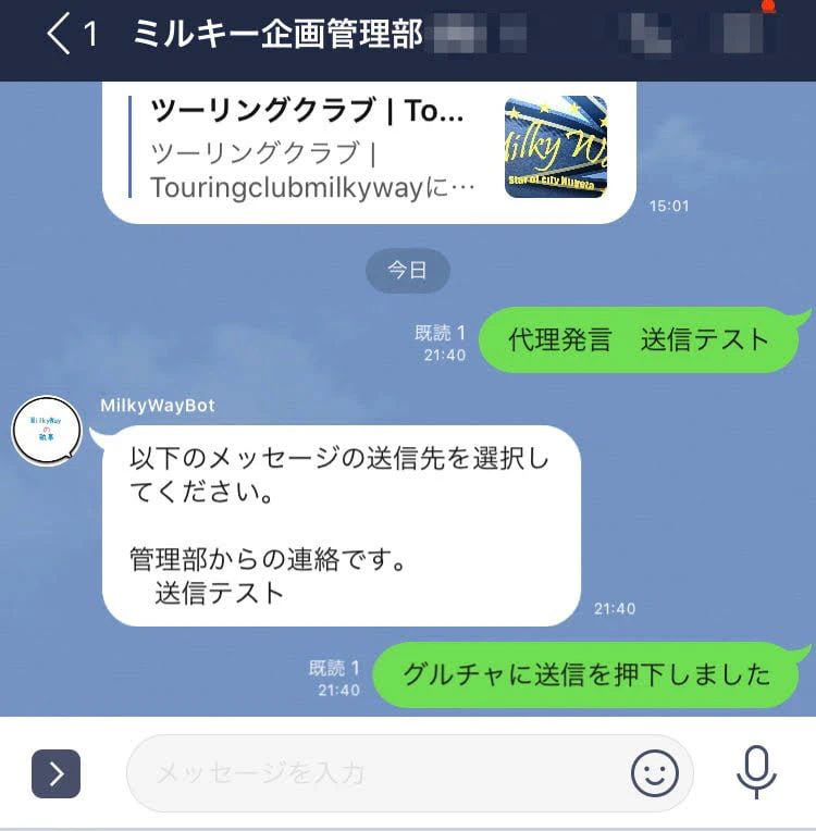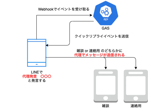 - 管理グループでトリガー発言: LINE Botがいる管理グループで「代理発言 〇〇○」と発言します。