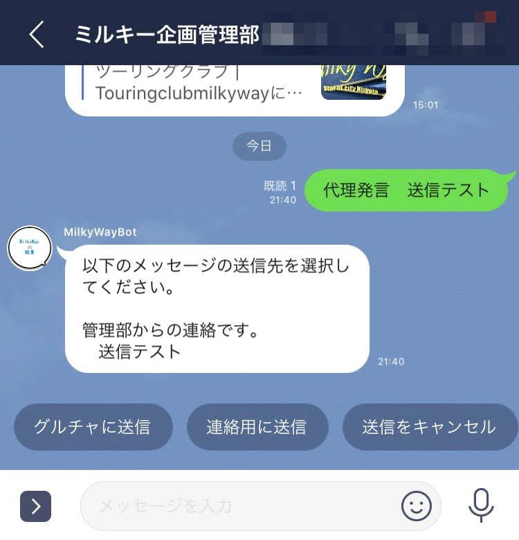 無事にBotが代理で発言してくれました!同様に「連絡用に送信」をタップすれば、連絡用グループにも送信できます。