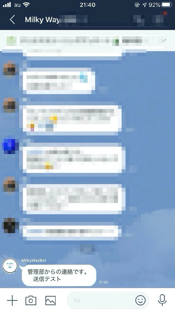 この機能は、管理用のLINEグループで特定のキーワードを含めて発言すると、LINE Botが他のグループにメッセージを代理で送信してくれる、というものです。