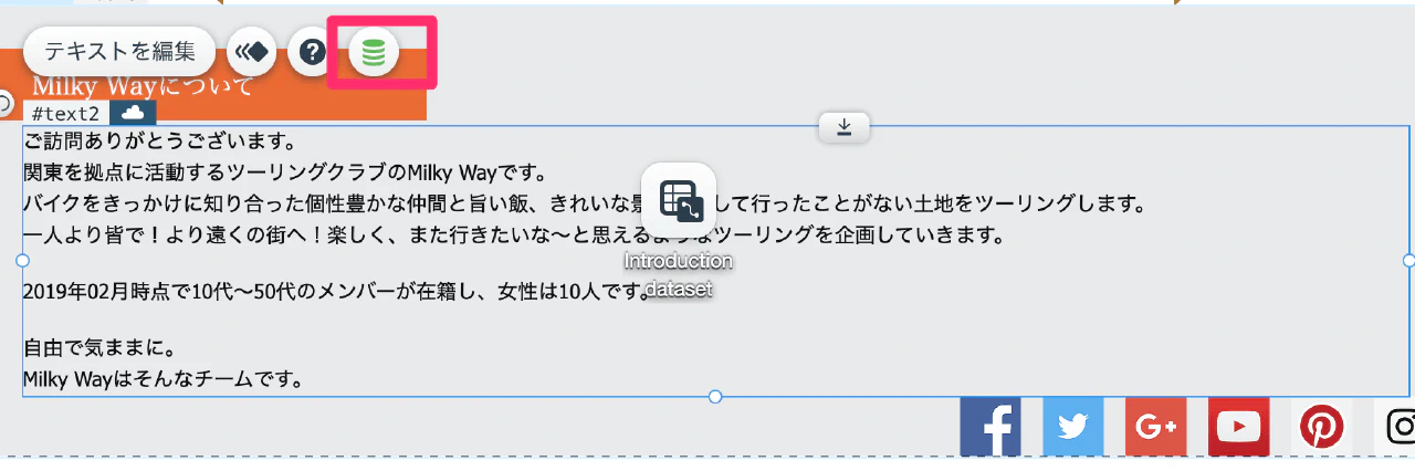 最後に、作成したデータベースとホームページの表示要素(テキスト、リピーターなど)を接続します。 データセットを追加し、各テキスト要素がデータベースのどのフィールドを参照するかを設定することで、データベースの内容が自動的にページに表示されるようになります。