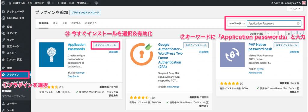 プラグイン>新規追加をクリックします。 - 検索ボックスに「Application Passwords」と入力します。