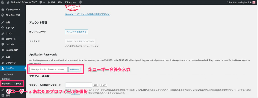 New Application Password Nameに、わかりやすい名前(例:gas-auto-post)を入力し、Add Newボタンをクリックします。