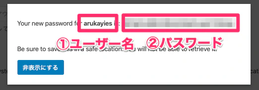 - 生成されたユーザー名とパスワードが表示されます。このパスワードは一度しか表示されないため、必ずコピーして安全な場所に保管してください。