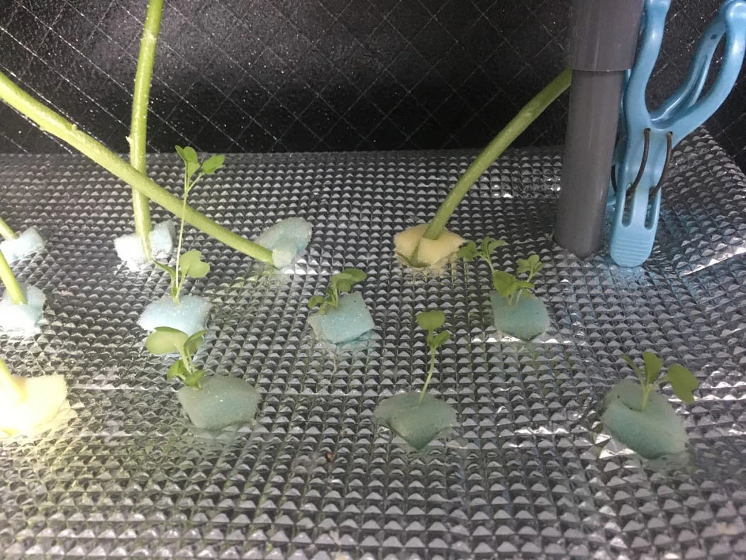 観察23日目を迎えたコマツナたち。いつものようにある程度苗が育ち、水耕栽培装置へ移すのに最適な状態になりました。
